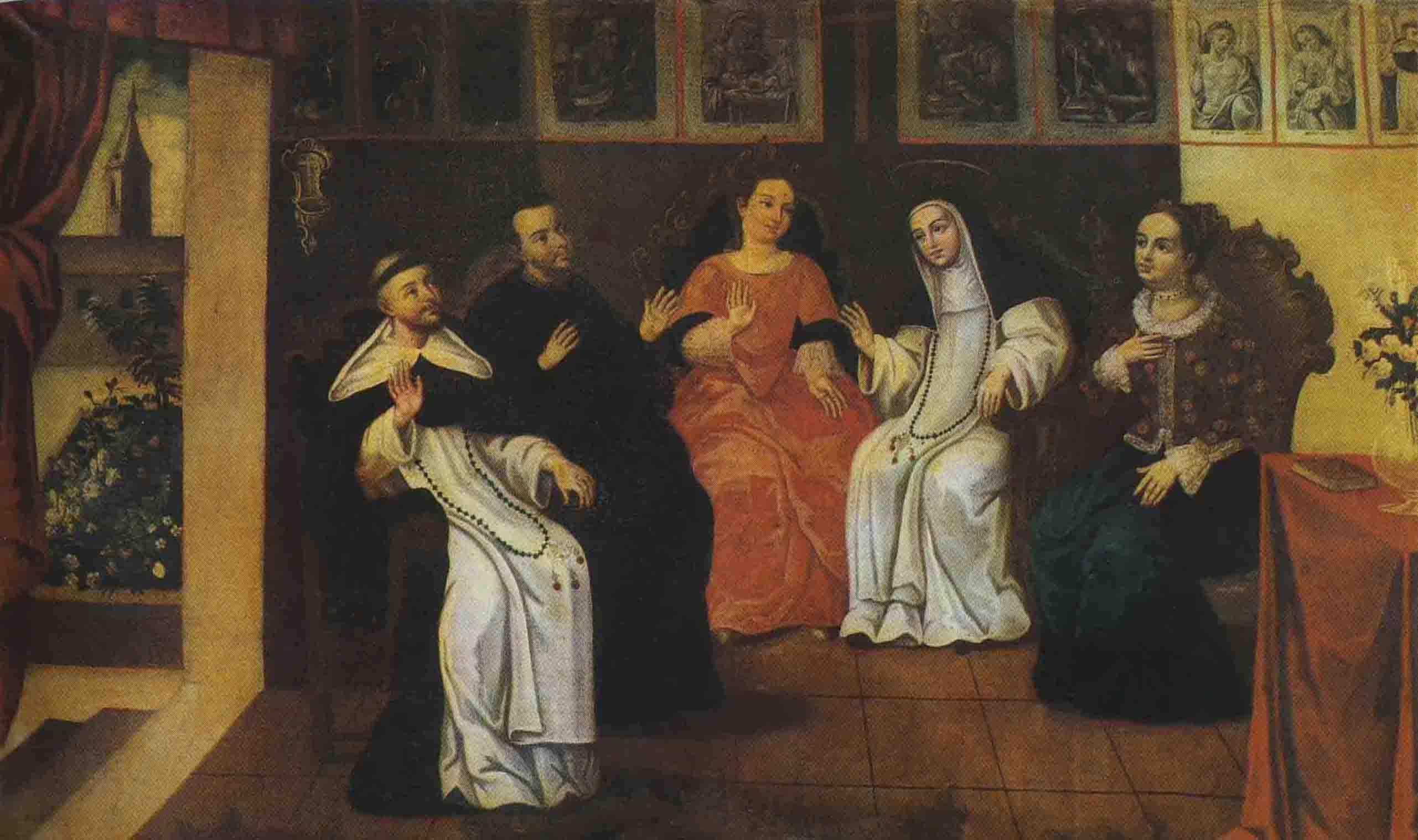 Saint Rose of Lima Meets With the Inquisition (detail). Signed in Quito, Ecuador, by Laureano Dávila ca. 1750. Displayed in the background are ten engravings, three of which are by Flemish engraver Cornelis Galle the Elder (1576-1659). See Mebold (1987, 347).